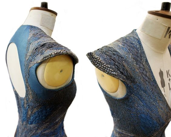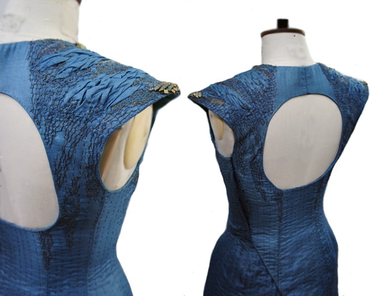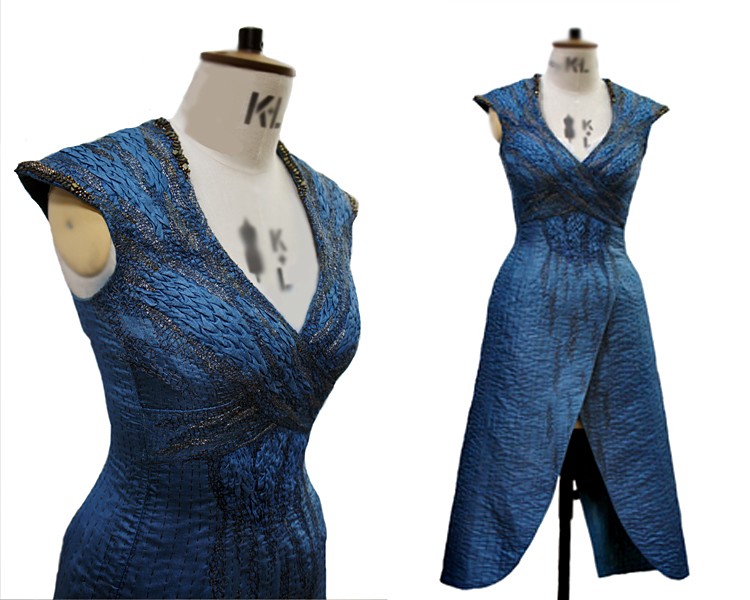 Hay un detalle que empieza a salir a la luz a partir de este momento. Las partes de arriba del vestido muestra una especie de piel de dragón y sus hombros se asemejan a la cabeza de una serpiente. Veamos un ejemplo de ello. El trabajo fue hecho por Michele Carragher una artista en bordado.