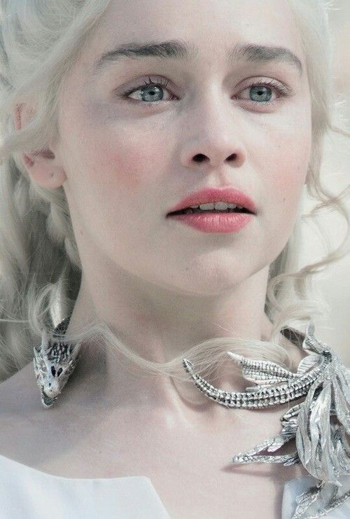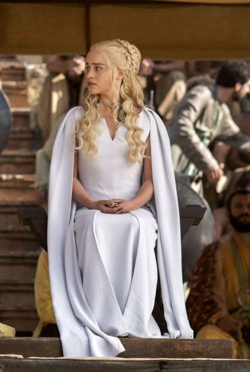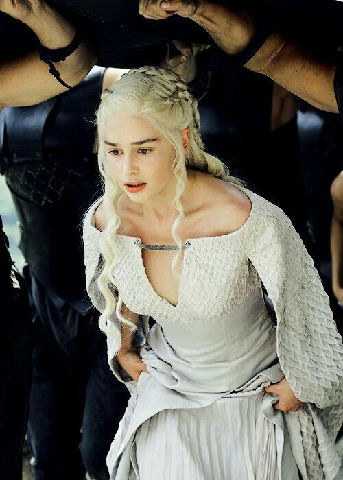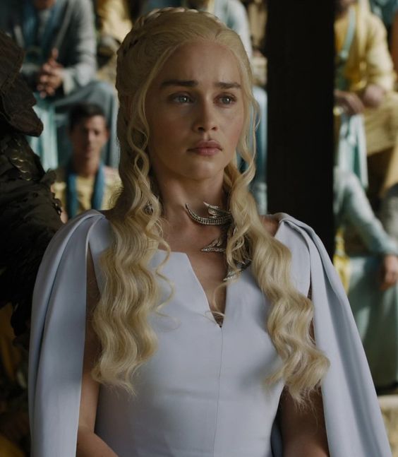 Y hablando de blanco hablemos de uno de los trajes más reconocidos de ella. Empecezamos en la escena donde Jorah entrega a Tyrion a Daenerys. En esta escena ella usa un vestido blanco casi identfico al anterior mencionado pero en esta ocasión lo que sobresale no es una textura sino un collar de 3 dragones. Aquí es donde vemos a nuestro personaje vestida ya como realeza en vez de una guerrera. El cuello es redondo ayuda a mostrar el collar que la representa.Veamos este vestido.