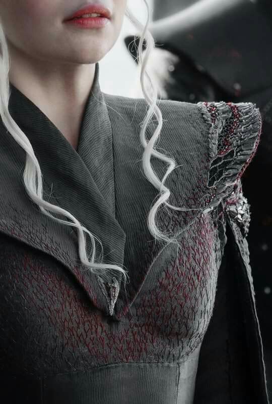 Las curiosidades de este traje son: Primero que al colocar la capa encima hay una evolución en la importancia del personaje porque nos da a entender que ya estamos en guerra. Segundo, cómo se puede apreciar el modelo es de la casa Targaryen y hace alusión al traje que usó su hermano en la temporada 1. Tercero, en su traje podemos ver el color rojo, el color de su cara. La diseñadora Clapton explicó que esto significa el proceso que ella esta haciendo para retomar el trono. Y cuarto, los toques de dragón símbolos de su casa. Cómo podemos ver la cabeza de dragón en la unión de su capa y en sus hombros las escamas del dragón, esto es para dar una representación de fortaleza. Un look perfecto para el inicio de la temporada 7.