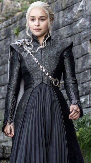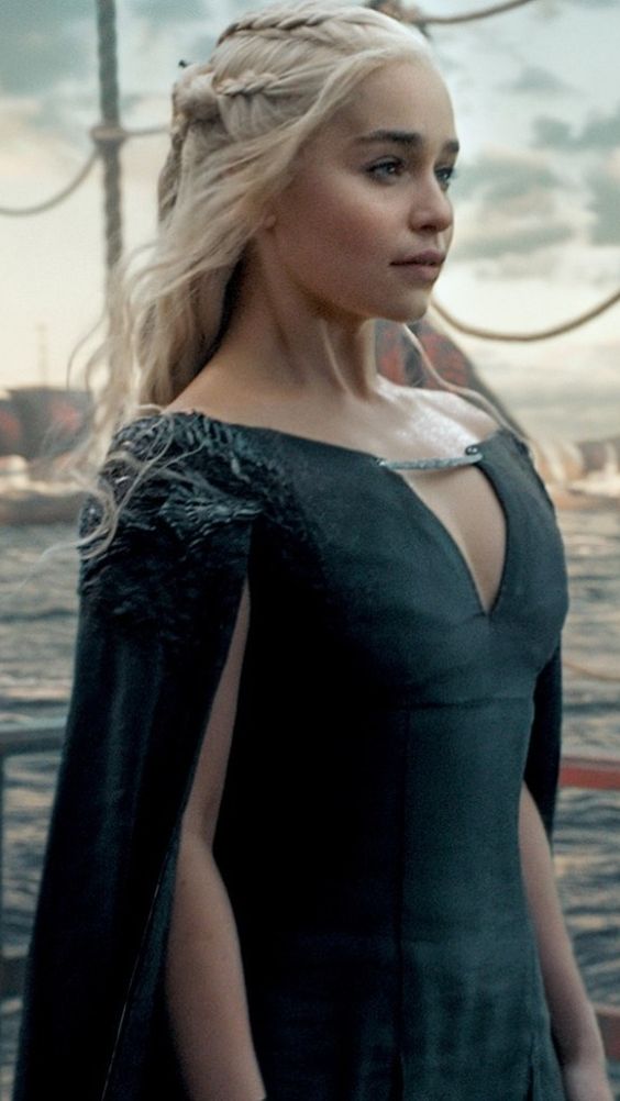Al final de la temporada 6 uno de los trajes que sobresale es el que vemos en el barco, donde es el mismo vestido blanco que ha usado ultimamente pero esta vez es por completo negro y en sus hombros podemos apreciar detalles de dragón. Esto desmuestra que para ese punto ella ya quiere mostrar un tono más fuerte de poder que de reflixibilidad que mostraba en sus tonos claros.