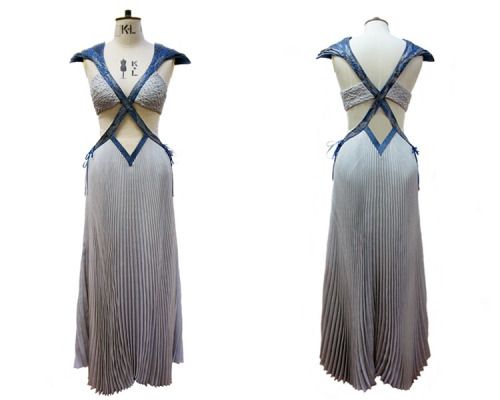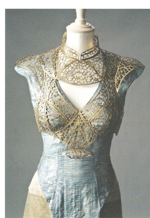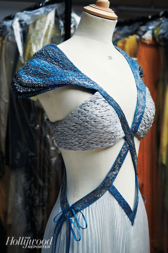 Más adelante en su historia vemos un look más sensual y fenenino. La idea detrás de este vestuario era crear un look fresco para la actriz ya que las locaciones donde estaban eran muy calientes. Tambien la diseñadora comenta que ella quería que el personaje se mostrara más como ella misma en la etapa en la que estaba pero que al mismo tiempo se viera como una guerrera. Este look pasó por todo los medios por la gran figura de la actriz. Además el formato del vestido se creó de forma para acentuar las partes de la mujer. También vemos que los hombros con la textura de dragón continúan siendo su marca personal. Lo que me encanta son los detalles de lso hombros y del pecho. Es un arduo trabajo que se ve hermoso al final. Veamos el vestido.