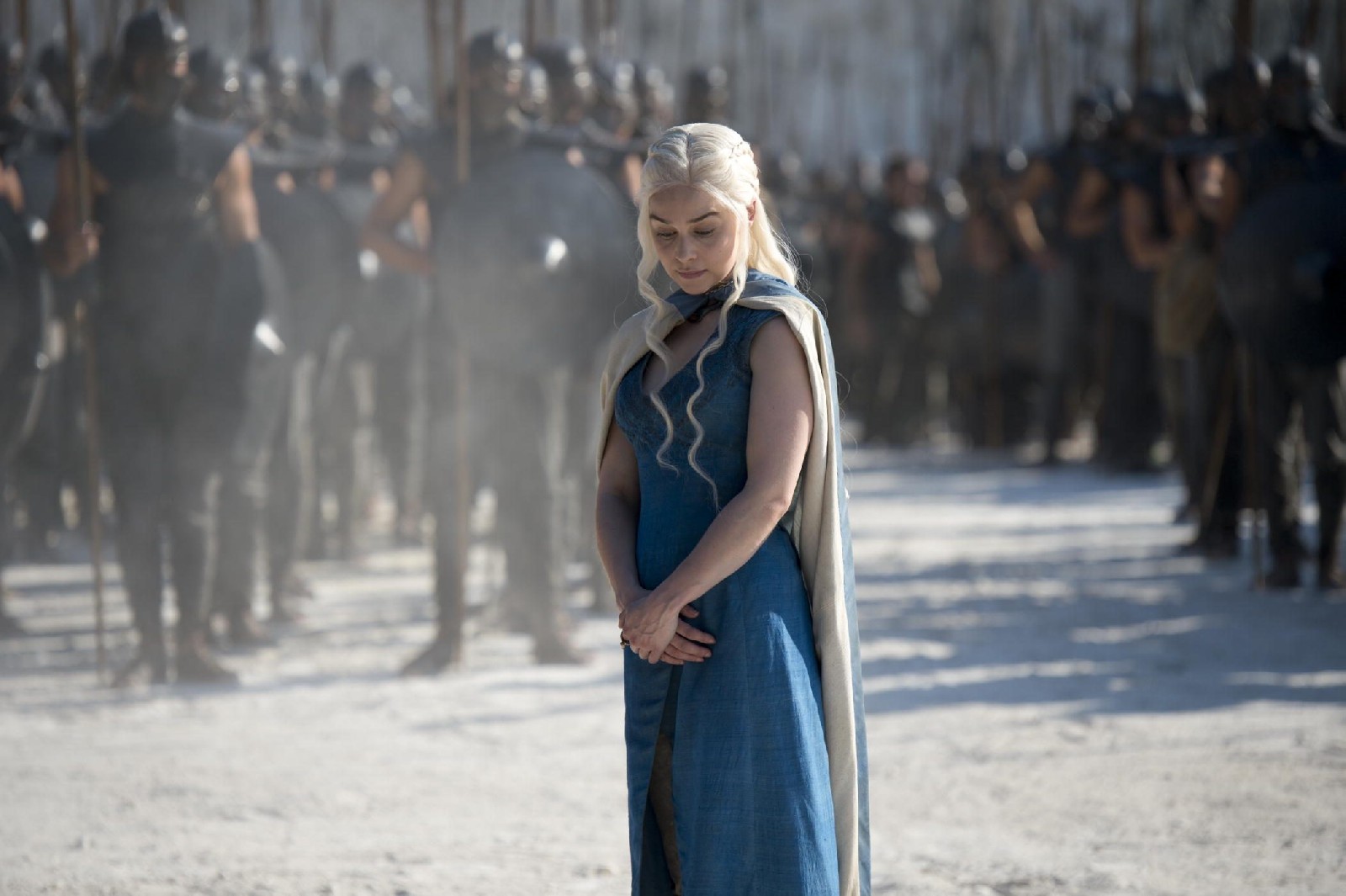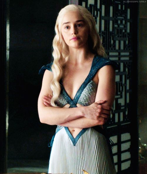 En el primer episodio nuestro personaje es presentada para ser casada ante el jefe de los Dothraki. En ese momento su vestido es seda de color azul pálido con dos broches de dragón en cada hombro. La idea de este vestido es verla "desnuda" ya que el jefe necesita ver lo que le ofrecen para matrimonio. La inspiración viene de pinturas de los artistas John William Waterhouse y Dante Gabriel Rossetti.También en una forma de darnos ver que ella esa desprotegida y sin ningún rol propio. Ella está a cargo de su hermano y de un futuro esposo.