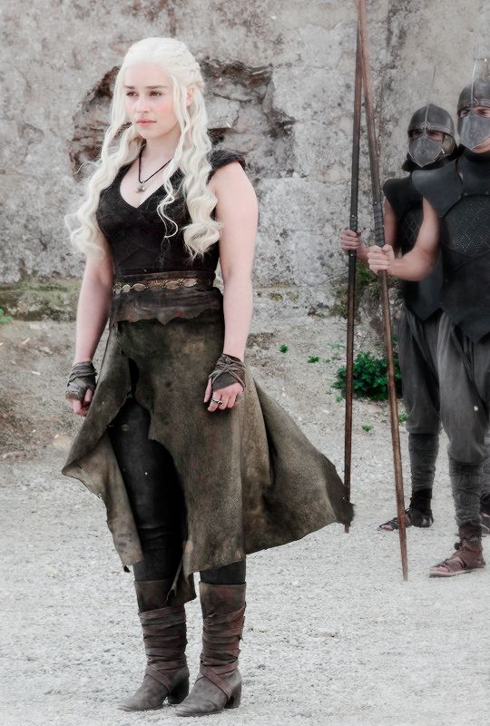 A partir de su matrimonio podermos ver como ella se empieza adaptar al nuevo mundo y al vez buscar su propio estilo. Al casarse con Drogo ella se convierte en un dothraki y con eso su ropa deja de ser delicada para crear un look más agresivo. En la historia se cuenta que un dothraki es una persona que no sigue leyes, que tienen mucha fuerza y tienen sus propias creencias. Pues sin lugar a duda su vestimenta desmuestra eso. El primer look con el que aparece es un blusa con pantalones cubiertos con una media falda. Parte de la vestimenta tiene cordón includio y detalles de la cultura nómada de Bedouin del Norte de África de donde se inspiraron. Este look lo lleva durante todo su recorrido hasta la muerte de su esposo que la lleva a enfrentar nuevas culturas y de nuevo una adaptación.